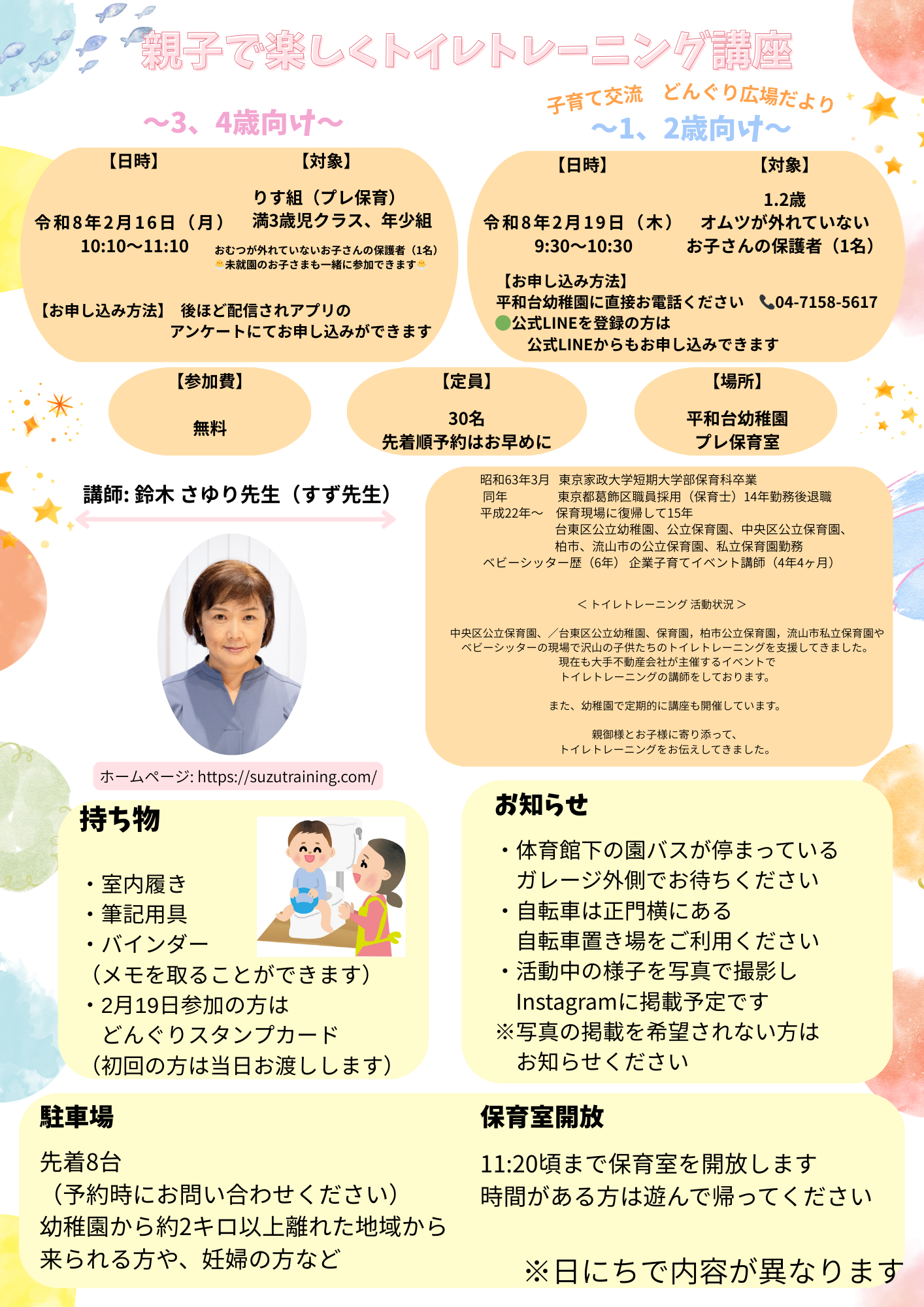 ホームページ、インスタグラム、在園児連絡アプリにて随時お知らせします。